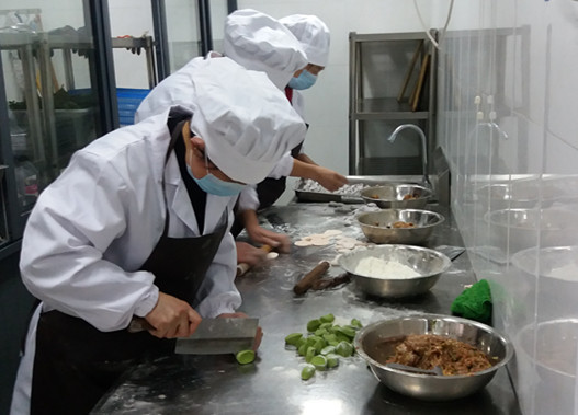 活动中,幼儿园的所有食堂从业人员整装待发,各就各位。随着一声“开始”口令,参赛人员一个个动作麻利,大家都迫不及待地进行和面、搓球、擀面皮,只见一块块小面团在他们手里翻飞、填馅、捏褶、收口,一系列动作一气呵成,一个个小巧而漂亮的水饺整齐地排列在盘子里,让人看得眼花缭乱。