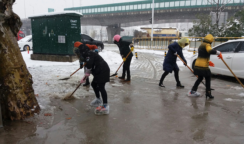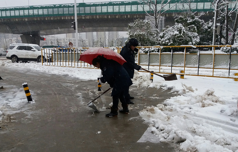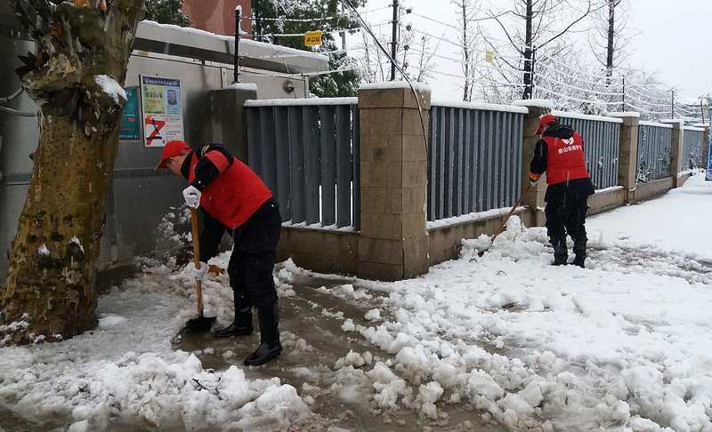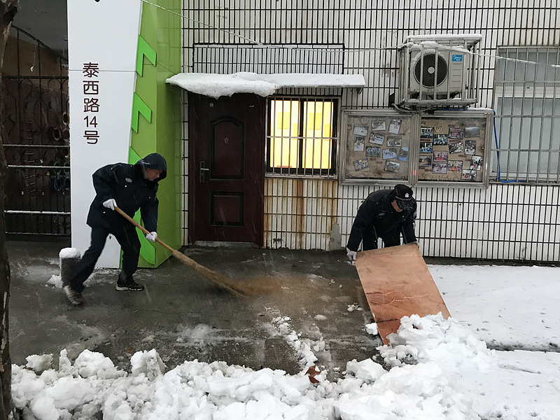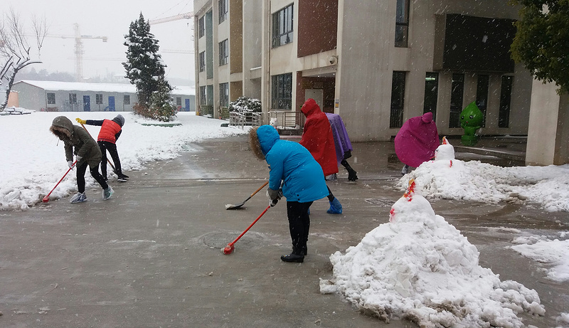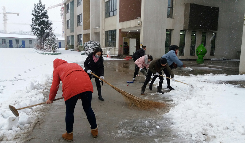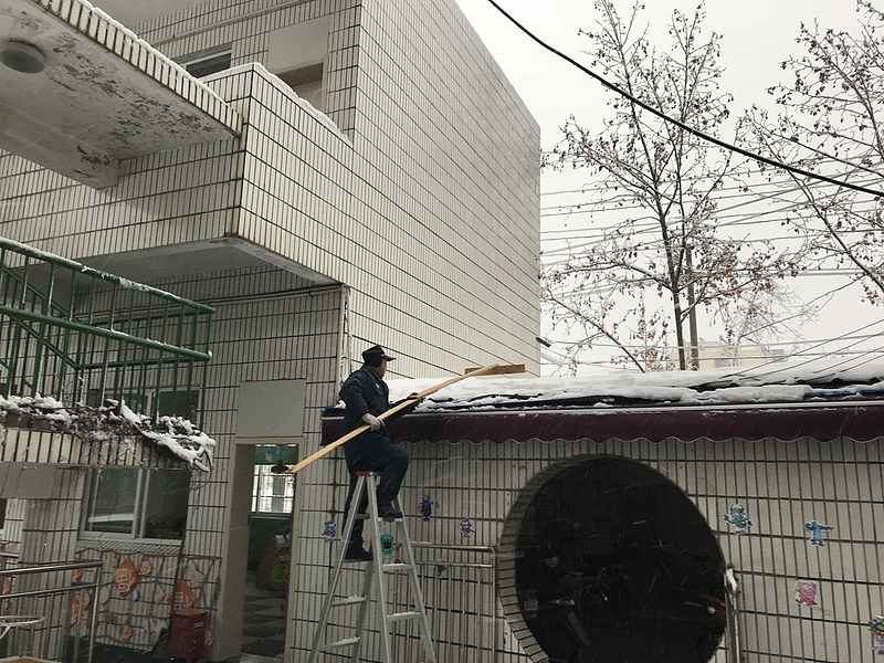 气温虽然很低,但是大家不畏天寒,不惧地冻,拿起大扫帚、地刷、铁铲,有的扫、有的铲、有的推,齐心协力,呈现出一派热火朝天的扫雪场景。大家全身心投入其中,虽然手和脸都冻得通红,鞋子都弄湿了,但一切丝毫没有影响教师们铲雪的热情,从幼儿园门口到园内,到处都是他们的身影。