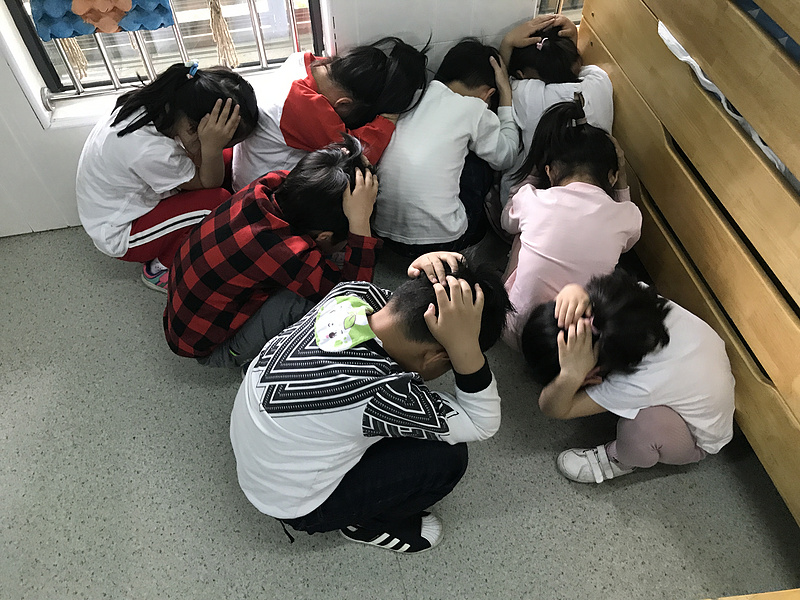 “叮铃铃~~” 一阵响亮的警报铃声突然响起,老师们马上放下自己手边的工作,立即组织班级幼儿躲到桌子下、墙角边等三角安全区域,并且用小手抱头蹲在地上。