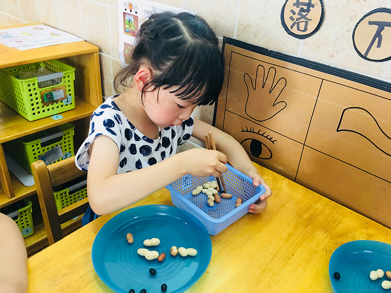 随着“预备,开始!”的口令,比赛开始啦!有的孩子动作非常熟练,握筷姿势和技能也掌握得非常好,速度非常快。也有小宝贝由于握筷动作不正确,小黑豆总是是夹不住……