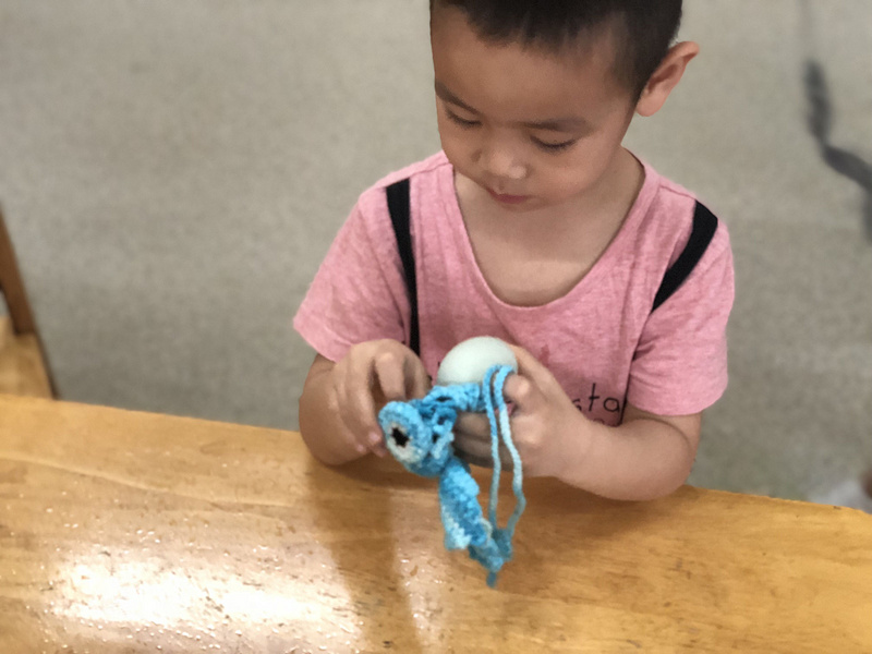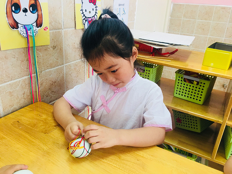 自己亲自动手把鸭蛋装彩色带子里,拎在手上掂了掂“这样就不会掉啦”,可爱的脸上乐开了花。