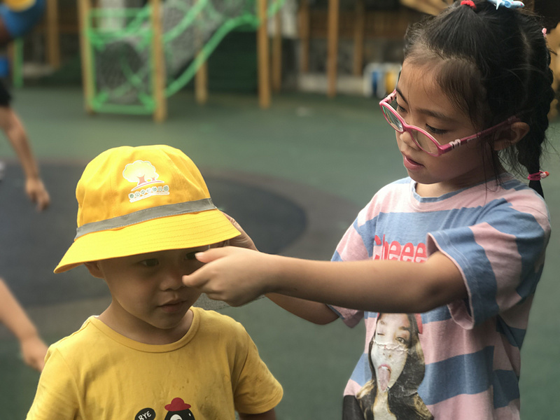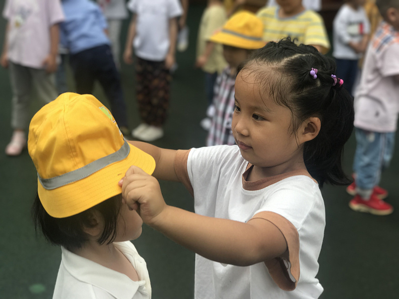看~大班哥哥姐姐们帮我们戴上这顶安全的小黄帽