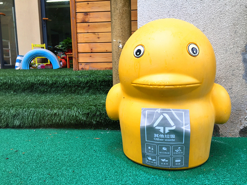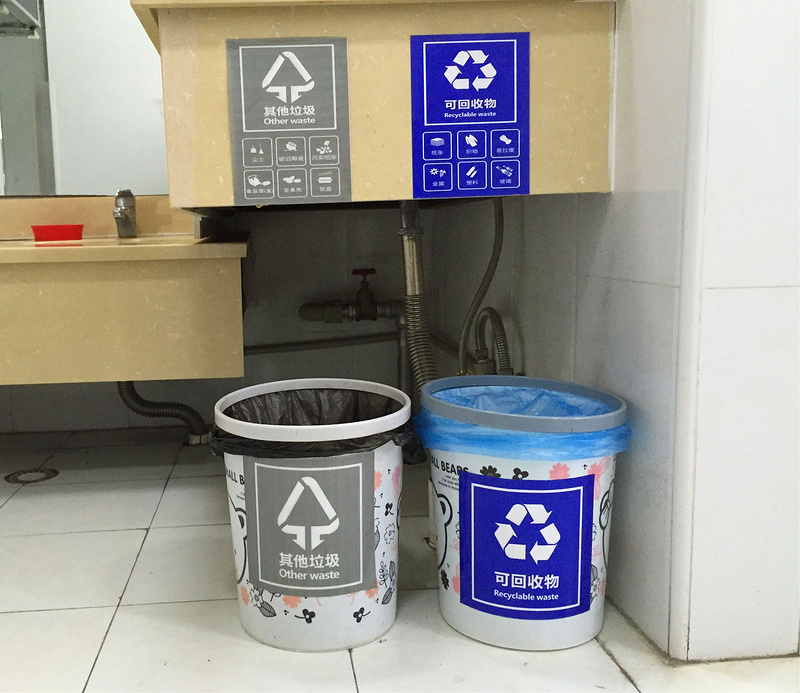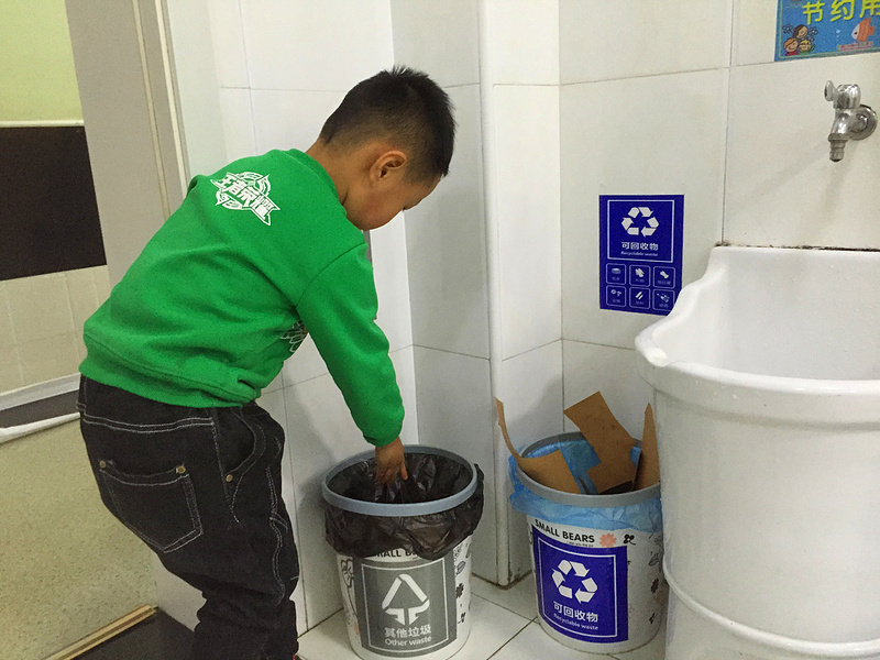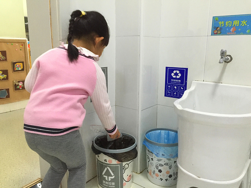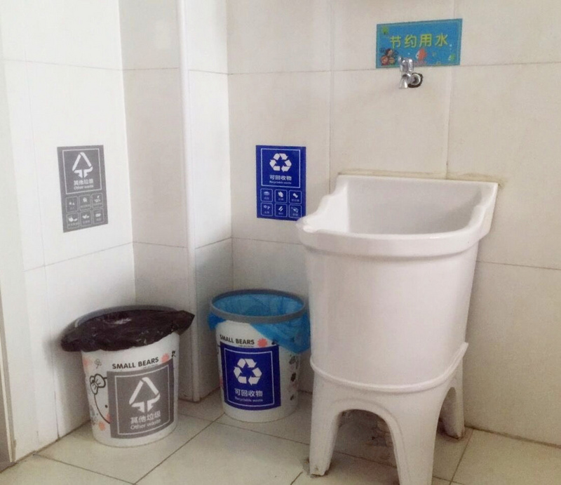 我园在户外操场、教室盥洗室、各功能室及办公区域均投放了带有垃圾标识的垃圾桶。
