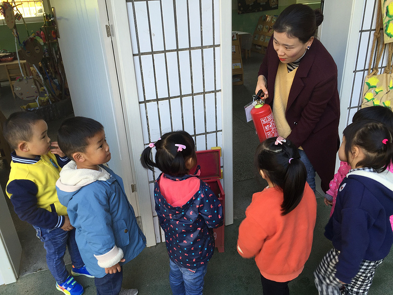 教师向幼儿介绍灭火器的使用方法