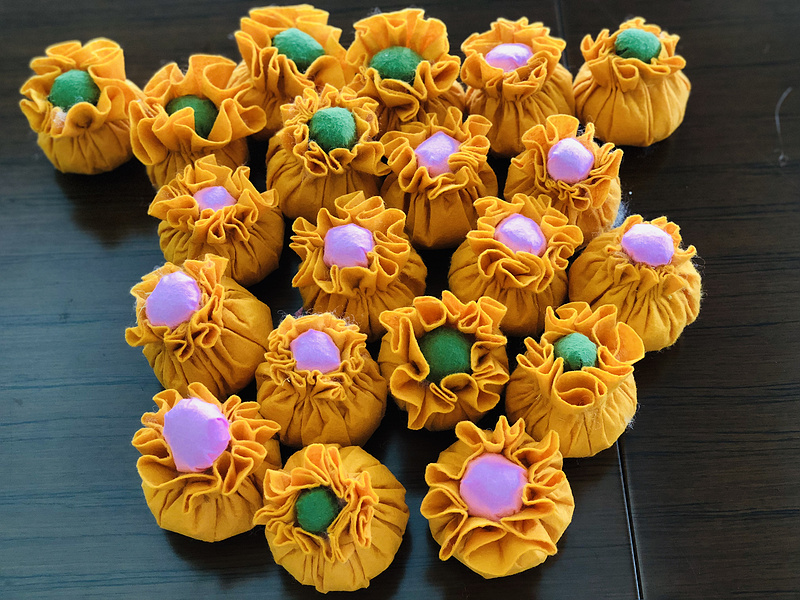 看!一块块小小的不织布在保育老师们的手中变成了一个又一个精美的作品。制作好的的馒头、烧卖、水饺、馄饨和包子,又好看又可口,让人忍不住想尝一口呢!