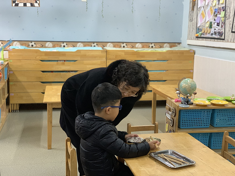 午餐时间到啦!专家们走进班级检查保育老师们餐前卫生消毒工作情况;进餐过程中李主任耐心的与幼儿交流,积极指导幼儿进餐。