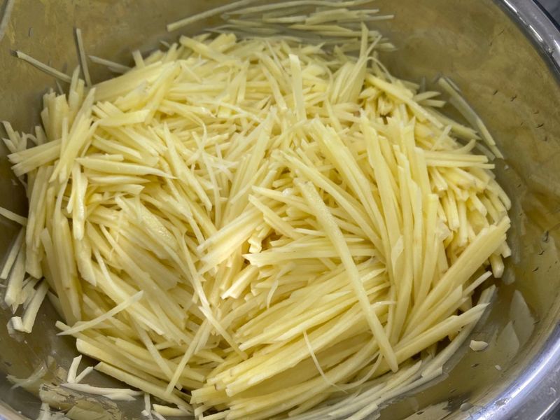 比赛结束,一盆盆土豆丝呈现在眼前,丝丝透亮,博人眼球。