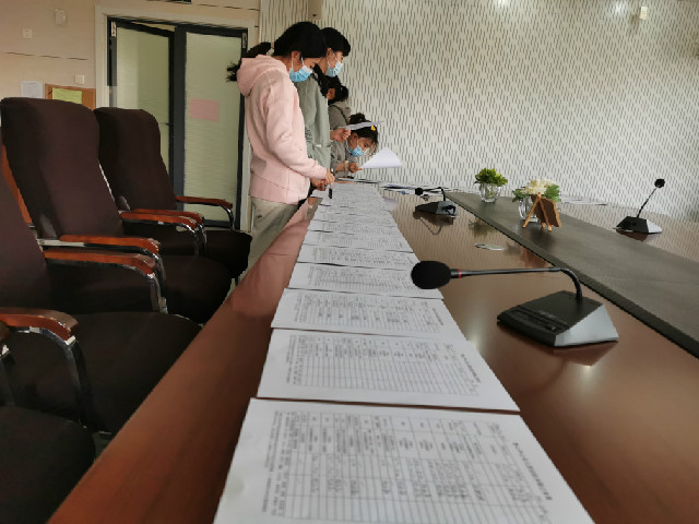 后勤园长潘园长与保健老师们随机抽取班级消毒表格,逐一摊开,认真对照标准进行评比。