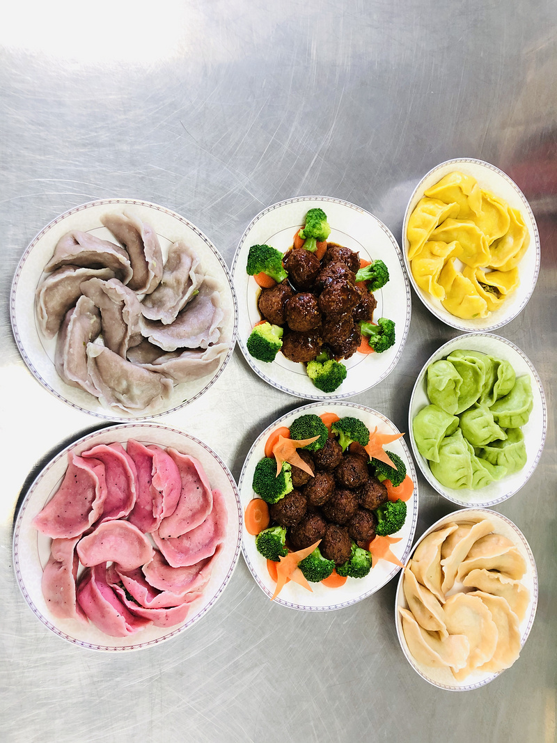 这边帮厨们首先进行抽签,决定个人所包饺皮食材,接着马上开始洗菜、调馅、和面、擀饺皮……忙的不亦乐乎。