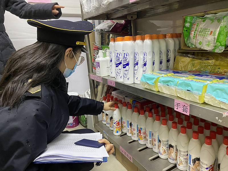接着检查组走进库房查看园内防控物资储备情况,检查储备量是否达到要求,有无专人管理。