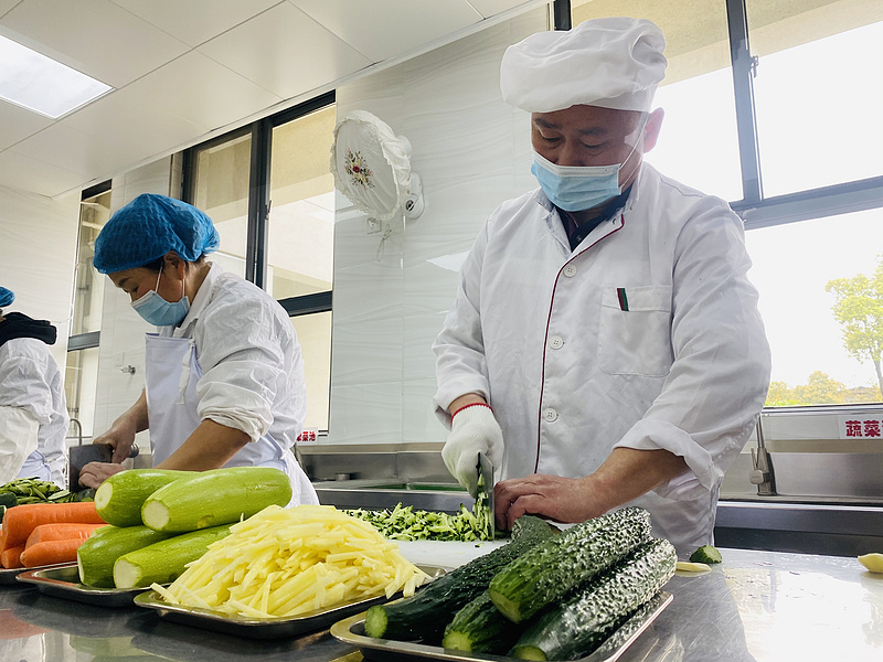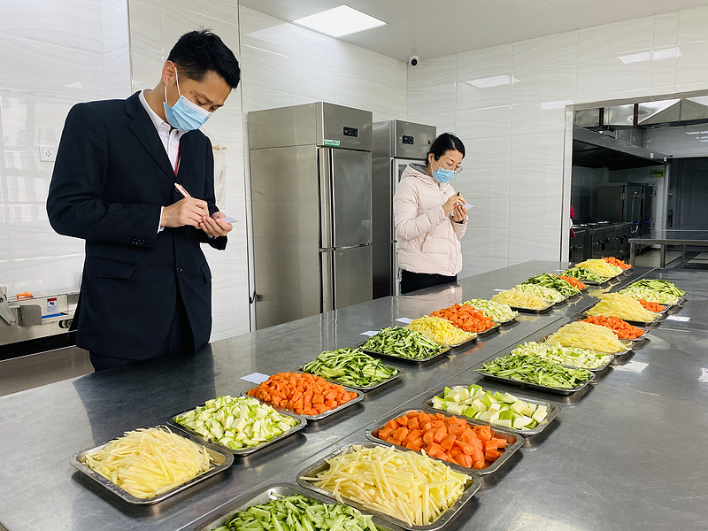 “哒哒哒”伴随着连续有节奏的切菜声,比赛开始了,食堂师傅们个个刀工娴熟,动作利落。