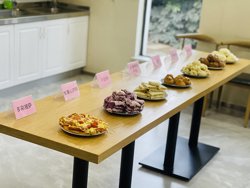 经过一番精心制作,一盘盘配料讲究、营养丰富、精致诱人、美味多彩的点心呈现在大家面前:多彩披萨、红薯糯米枣糕、香葱小花卷、紫薯山药糕、鲜汁菜肉包、红糖发糕。