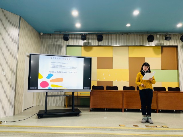 在观摩完班级的自然角、语言区环境后,赵登燕园长就我园本学期开展课程游戏化项目以来,自然角和语言区的不断调整、孩子的变化和教师的收获进行分享汇报。