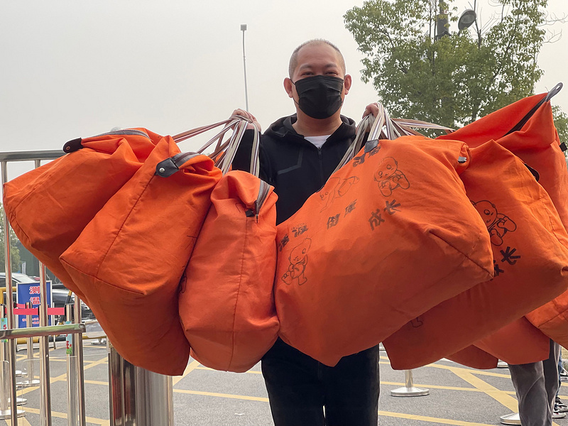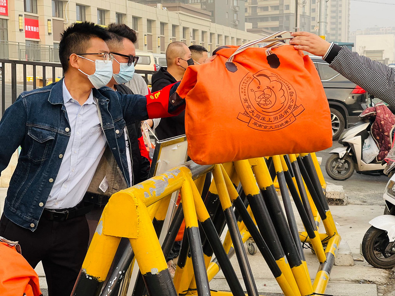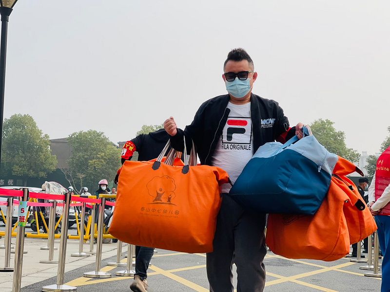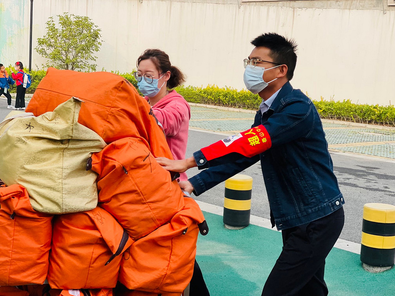 “这位家长,被子给我吧”,他伸出有力的臂膀接过家长递来的被子。