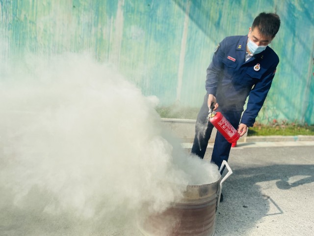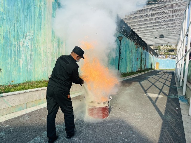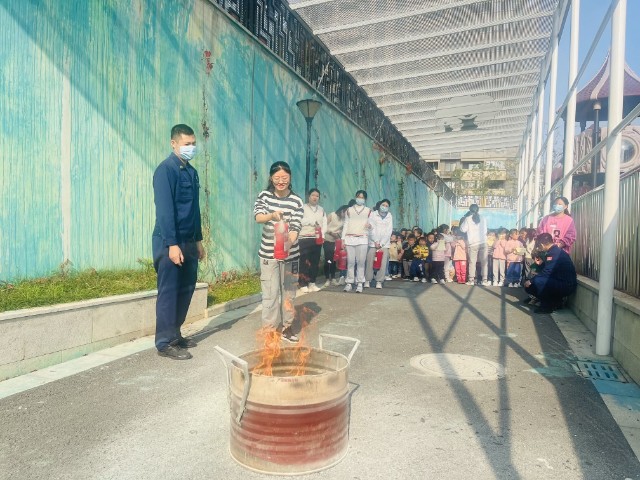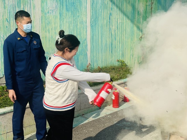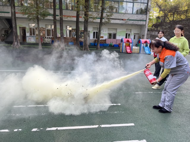 老师、保安及食堂的叔叔阿姨们练习使用灭火器、灭火毯;