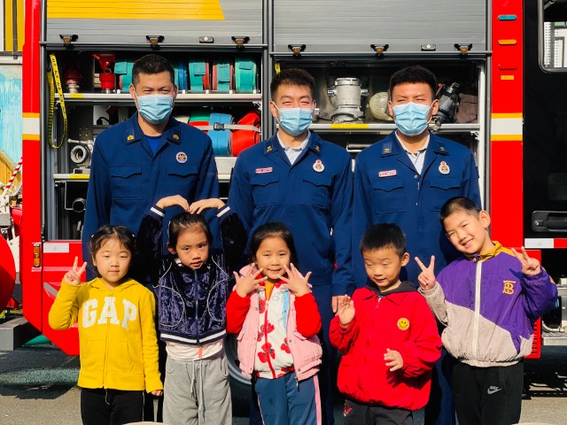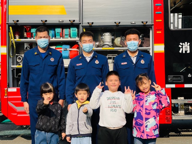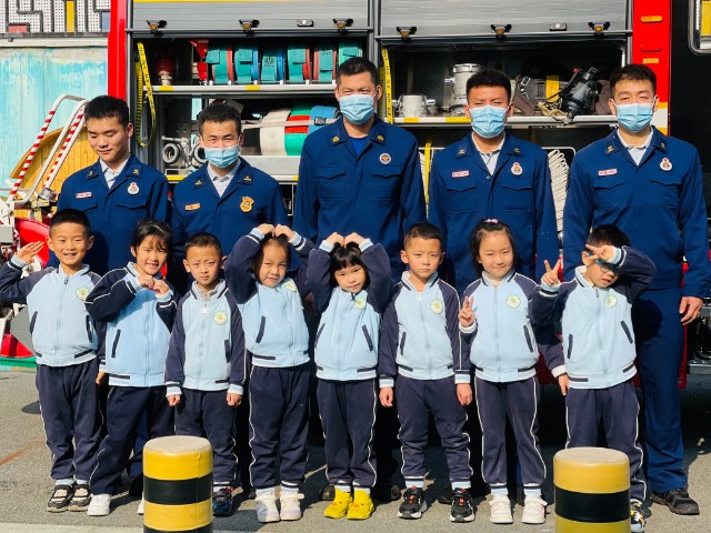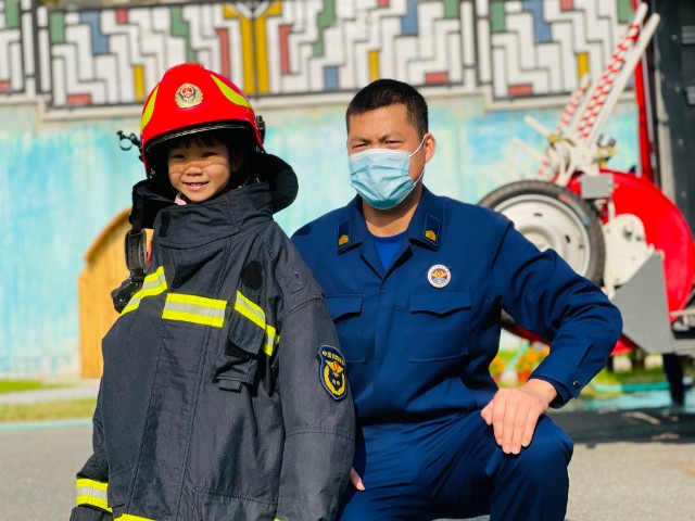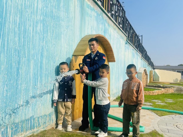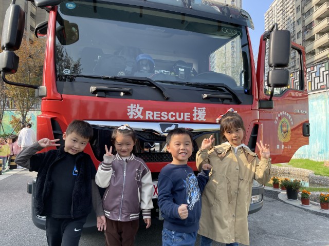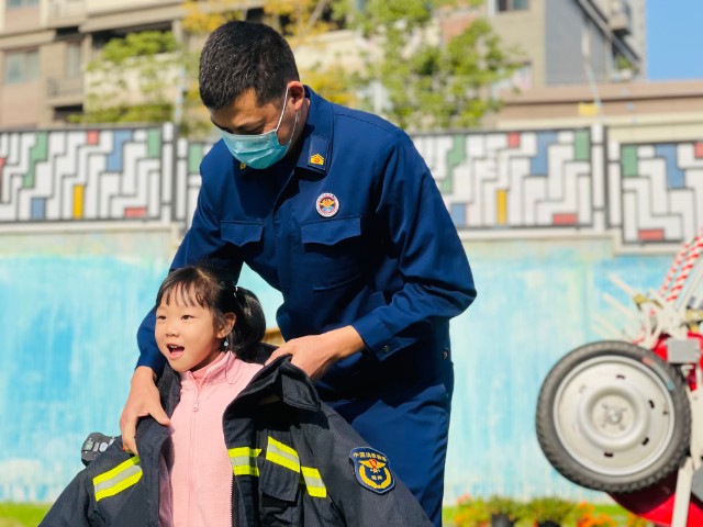 我也来灭火啦!消防员叔叔教我们如何使用消防水枪,还让我们穿上了消防衣哦!