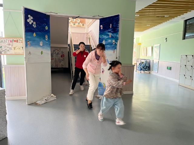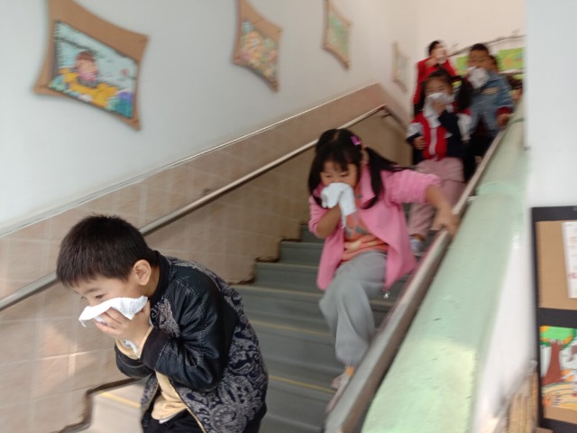 “快快快发生‘火情’了,孩子们大家快弯下腰、捂住口鼻,跟着老师走。”