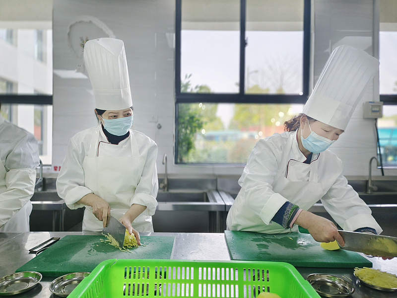 随着一声令下,食堂师傅们立刻进入了状态,神情专注,左手按住原料,右手拿起菜刀,“哒哒哒”的切菜声此起彼伏。不一会儿,晶莹剔透的土豆丝,玲珑小巧的土豆丁、鲜艳整齐的土豆片,一件件作品在师傅们操纵娴熟的刀锋下渐渐显现。