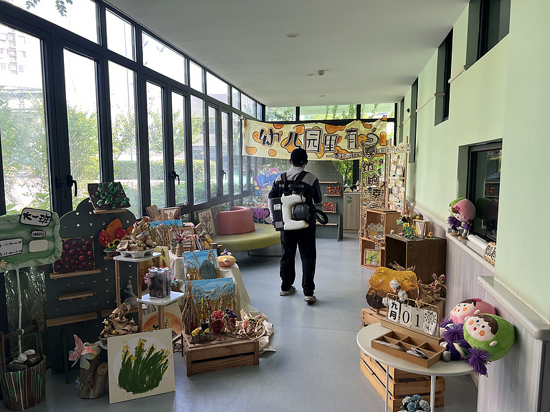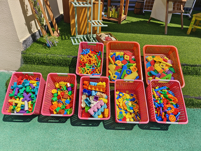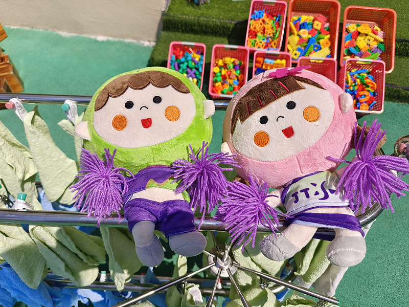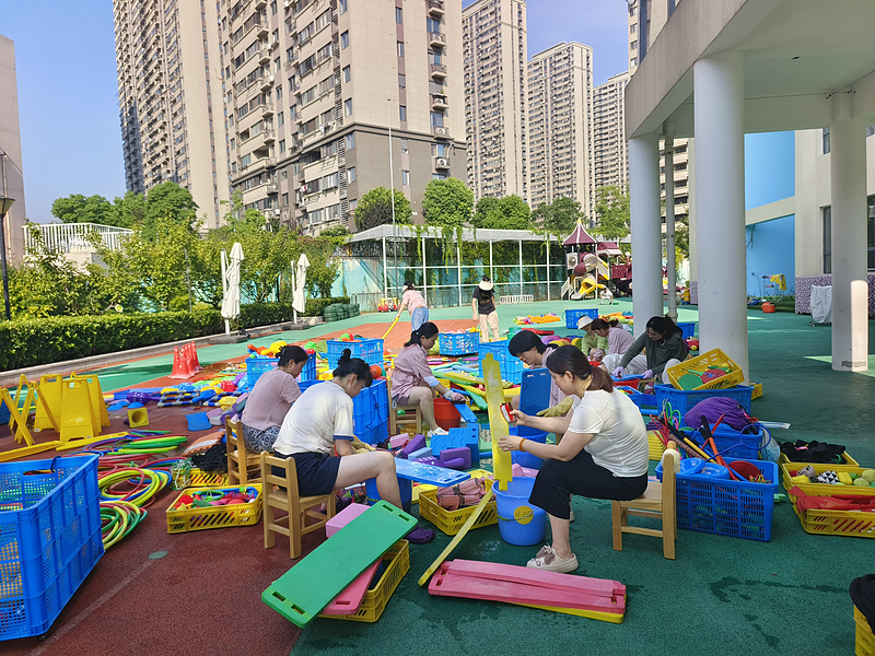 保育老师正在给玩具宝宝们泡澡消毒呢,把积木、皮球、推车刷洗得香喷喷的,晒太阳的时候还会翻面,让每个玩具都变得干干净净的。