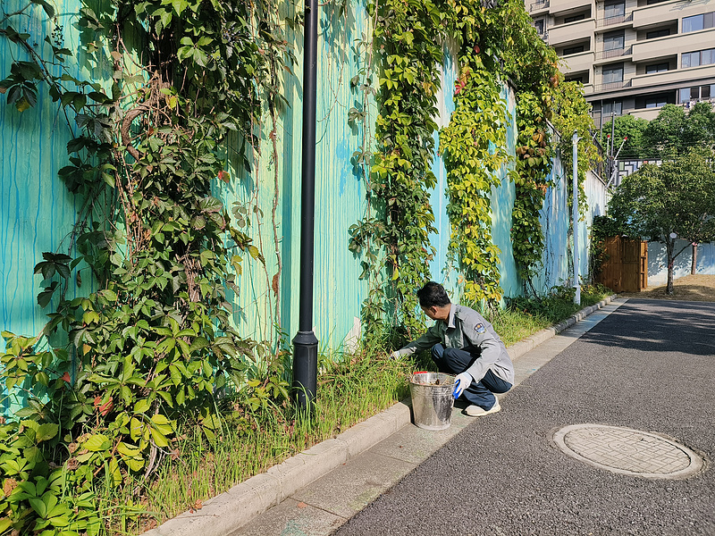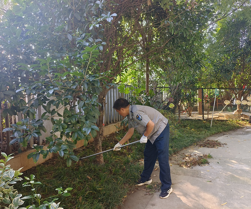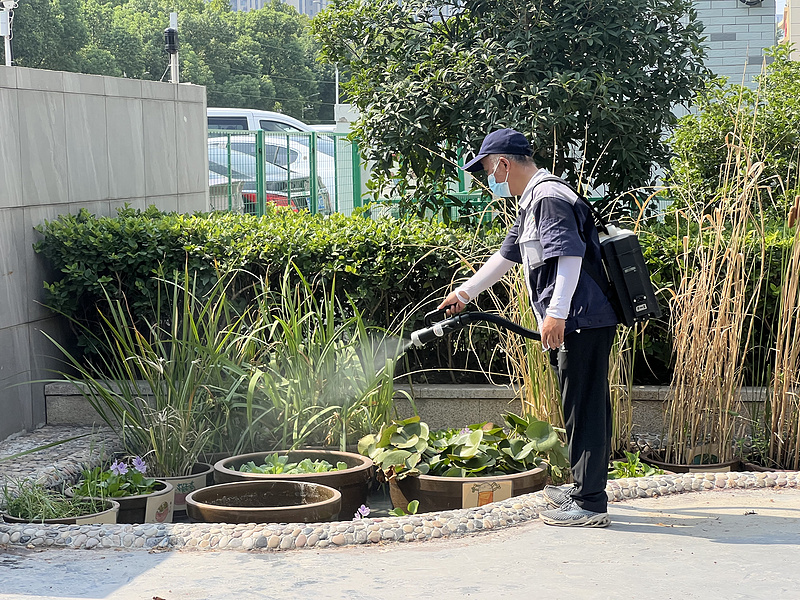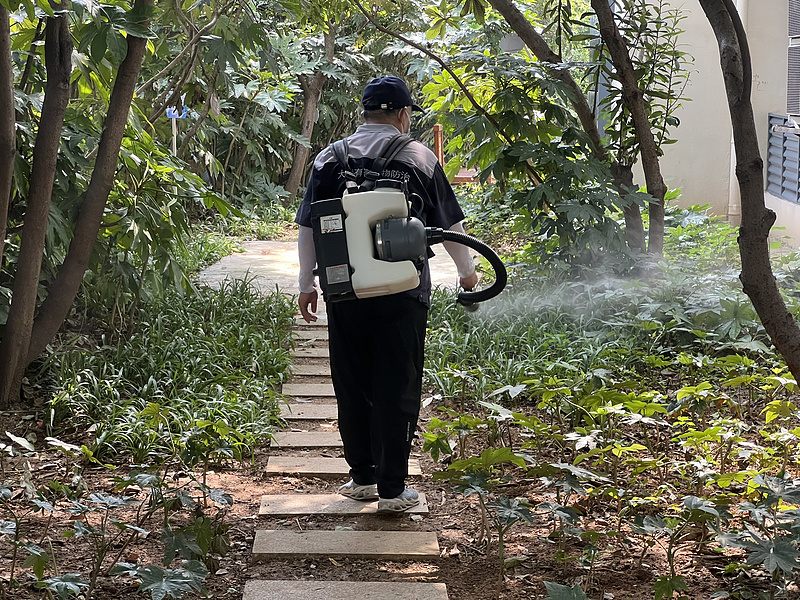 秘密武器登场,专业的消杀叔叔来喷安全的灭蚊药水啦!他对着草丛、墙角、小树