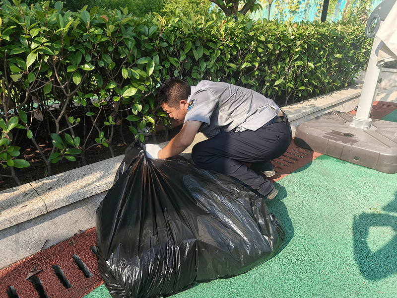 保安伯伯们用小耙子、小扫帚及神奇的“吹风机”(鼓风机),把落叶堆成小山,并装进大大的垃圾袋里。伯伯说,落叶堆久了会变成蚊子小怪兽的家,所以一定要清理干净。