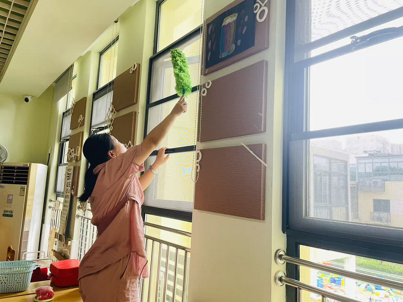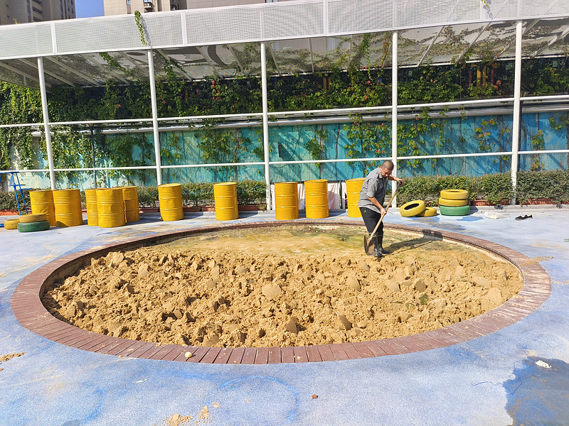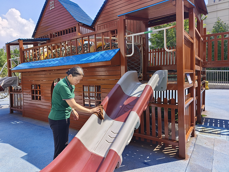 保育老师及保洁阿姨们在清洗户外滑梯及器械,她们用刷子刷掉上面的灰尘,还进行了消毒,保安伯伯还对我们的沙池进行翻晒,这样小朋友们玩的时候就不会沾上细菌和病毒啦!
