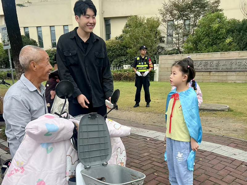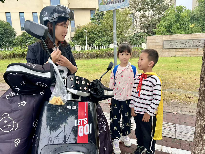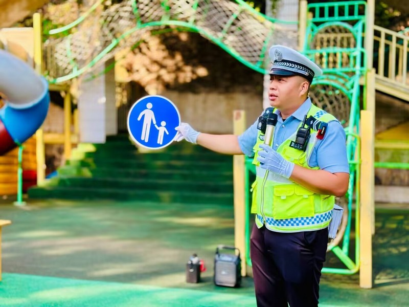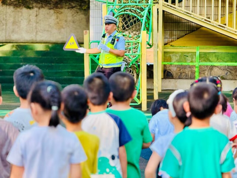 大班小朋友化身“交通安全宣传员”,在老师的带领下提醒接送幼儿上学的叔叔阿姨、爷爷奶奶们骑电动车时要佩戴好安全头盔,注意减速慢行。在互动中,孩子们的安全意识得到了巩固,也让更多人关注到交通安全的重要性。