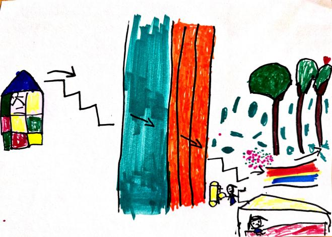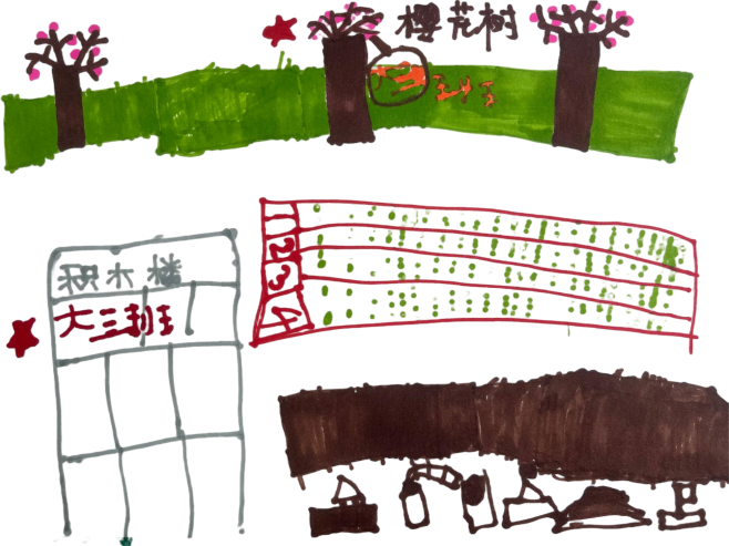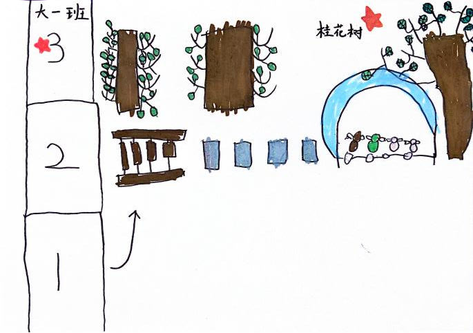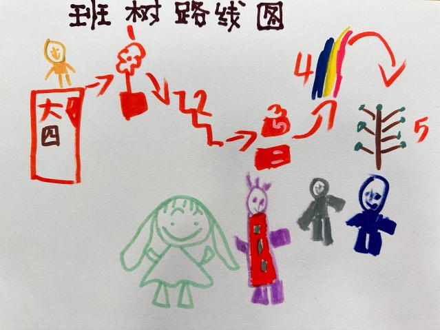 我们的班树在哪里呢?孩子们用童趣的语言描述路径:“从台阶下去,再往前走”“樱花树在红色跑道边上”。教师支持幼儿通过绘画、符号等方式表达空间关系,例如用圆圈代表班树、彩虹线表示跑道。中大班幼儿还能独立设计更复杂的路线图,甚至结合自然测量、自然笔记等方式记录班树特征。这一过程不仅发展了幼儿的空间认知能力,更促进了其抽象思维与表达能力的提升。