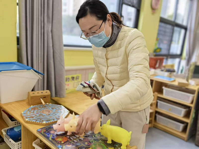 每天孩子离园后,开启紫外线灯进行全面消毒,彻底消灭空气中的病菌;每周三和周五会对玩具、图书等进行消毒。
