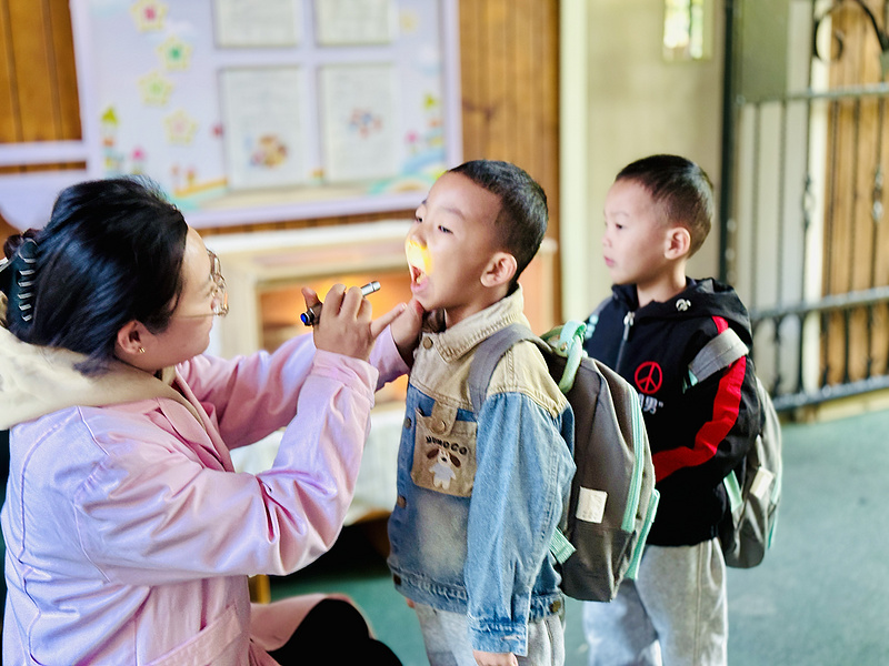清晨,各岗位人员早早地完成了开窗通风、环境打扫和晨间消毒等各项准备工作,为孩子们营造一个干净舒适的入园环境。入园的第一道防线从晨检开始,保健老师严格执“一问、二看、三摸、四查、五登记”的流程。