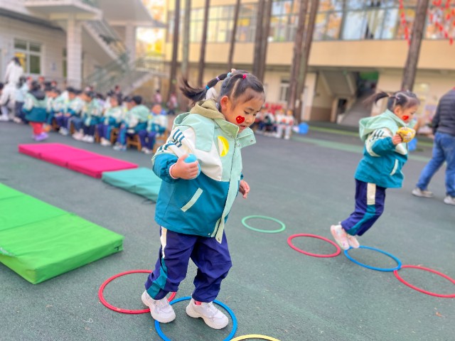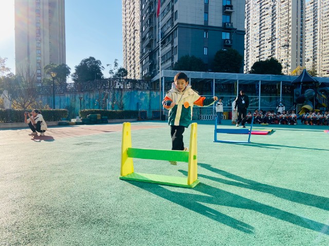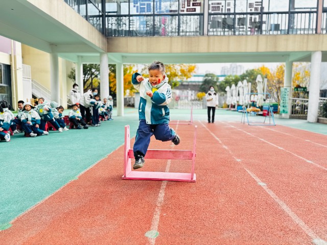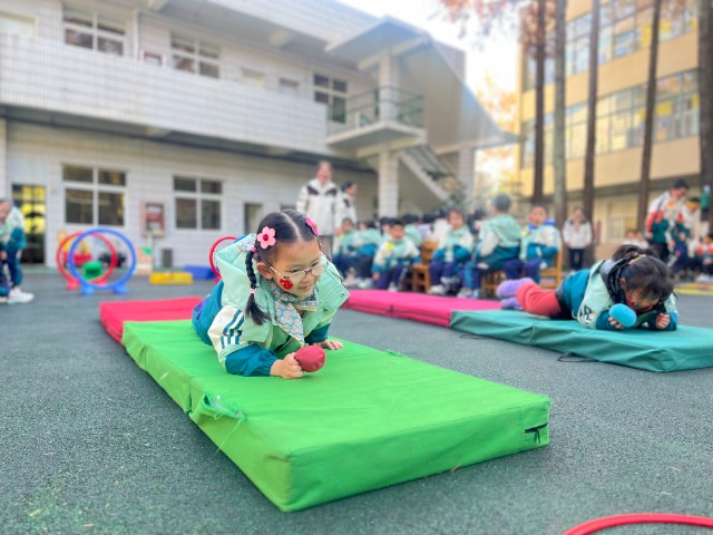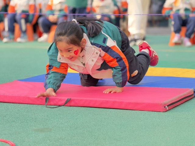 游戏项目的竞技现场,更是精彩迭出。小班“小蚂蚁运粮食”项目中,孩子们背着“粮食包”爬过地垫、走过平衡木,虽然小脸涨得通红,却执着地把“粮食”送到终点,老师蹲下身鼓励:“你就是最棒的小蚂蚁!”
