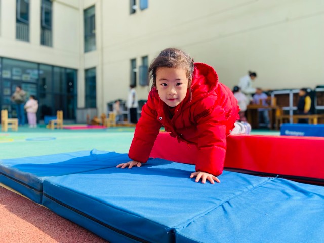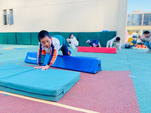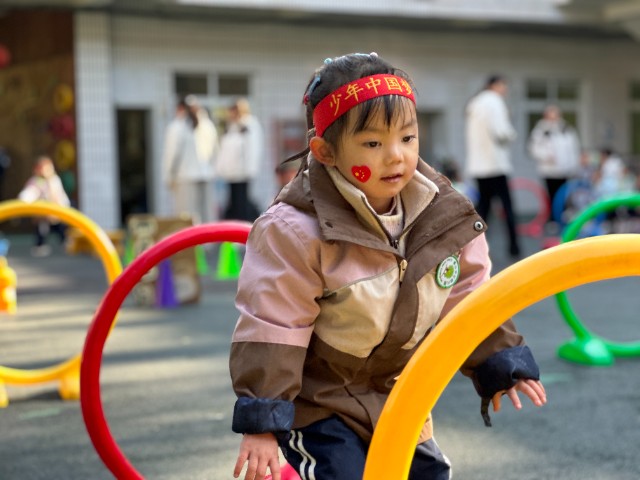 大班“勇闯星球”项目里,孩子们翻过山丘、钻过圈圈,在层层关卡中挑战自我。