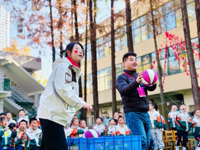 家长和老师们一起进行投篮比赛,围观的孩子跳着脚喊“加油”!