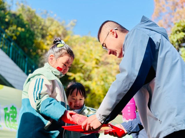 比赛结束后,最激动的领奖环节来了。孩子们捧着“蔬菜奖品”——小班的红薯、中班的萝卜、大班的洋葱举着奖品向家长展示,脸上洋溢着自豪的笑容,眼神里满是成就感。