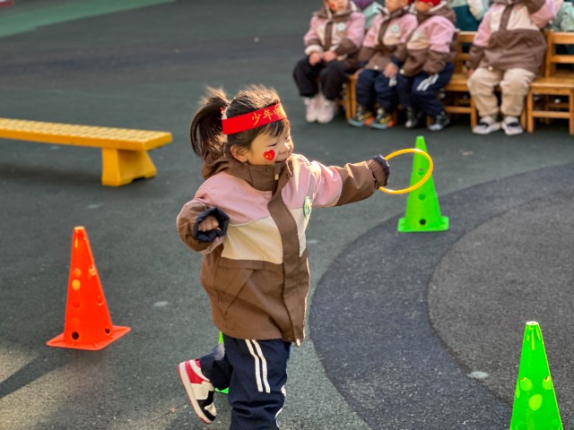 我们将竞赛游戏融入一日生活中的晨锻和下午的户外游戏中,充分利用零散时间玩竞赛游戏,提升运动能力。小班孩子抱着篮球,一个一个地拍着。中班孩子分组进行助跑跨跳,变身“小飞人”!大班的孩子变身“小小宇航员”,勇闯航天基地。