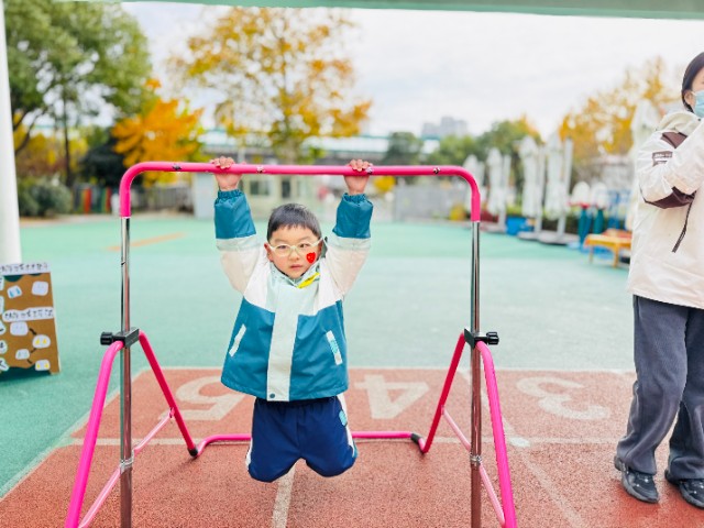 中班“我是小飞人”赛场,孩子们双手抓杠悬空吊起,欢呼声响彻操场。